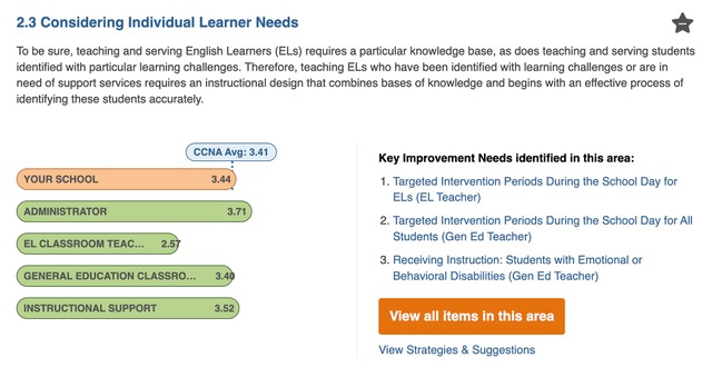 The CCNA assessment activity focuses on multilingual learner support, while also covering broader practices that affect all students. This evidence-based tool measures key aspects of school-wide leadership practices that impact instruction. Through the CARE Coaching data process, school teams leverage the resulting action-based data to target improvement areas, identify professional learning needs, and create action-oriented improvement plans.